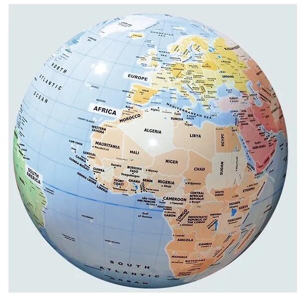 A 42 cm átmérőjű felfújható földgömb politikai világtérképpel, gyönyörű színeivel egyedülálló, és elég erős ahhoz, hogy a gyerekek játszhassanak vele. A fővárosok és a nagyobb városok neve, valamint számos sziget neve jelenik meg.