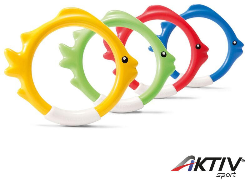 Tartsatok izgalmas versenyeket ezen a nyáron ezekkel a medence aljára süllyedő halacskás karikákkal. Csak dobd be a medencébe, várd meg még elsüllyednek majd versenyezzetek ki tud többet a felszínre hozni.  - 4 db élénk színű halacska, kék, zöld, piros és sárga